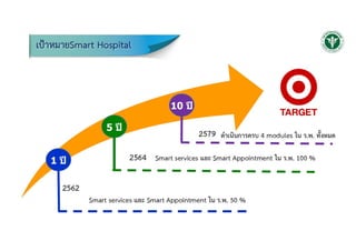รพ. ทั่วประเทศ รวมทั้งคลินิกหมอครอบครัว รพสต. ที่มีความพร้อม เปิดให้บริการ ไม่น้อยกว่า 100 แห่ง 2. ประชาชนเปิดใช้งานระบบไม่น้อยกว่า จํานวน 5,000 ราย เป้าหมายระยะที่ 2 1. เชื่อมโยงข้อมูลให้ครอบคลุมมากขึ้น 2. ร่วมพัฒนากับนักพัฒนา/นักวิชาการ (customer segmentation, human center design)