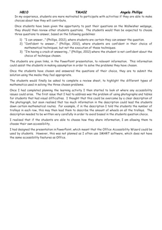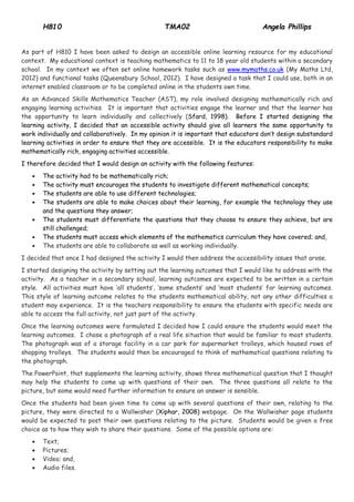 The document describes a learning activity designed by Angela Phillips for teaching mathematics to secondary school students. The activity aims to be mathematically rich, engage students, and allow choice and collaboration. It involves students generating math questions from an image, posting questions online for others to answer. Phillips considers accessibility issues like descriptions for visually impaired students and formats for different disabilities. The activity and its strengths and limitations in accessibility are evaluated.