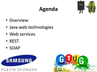 The document discusses various web development technologies including REST, SOAP, Servlets, JSP, JSF, and Spring Android. It provides an overview and agenda that covers Java web technologies, web services, REST, and SOAP. REST (Representational State Transfer) and SOAP (Simple Object Access Protocol) are defined and references are included for further information. Contact information is also provided at the end.