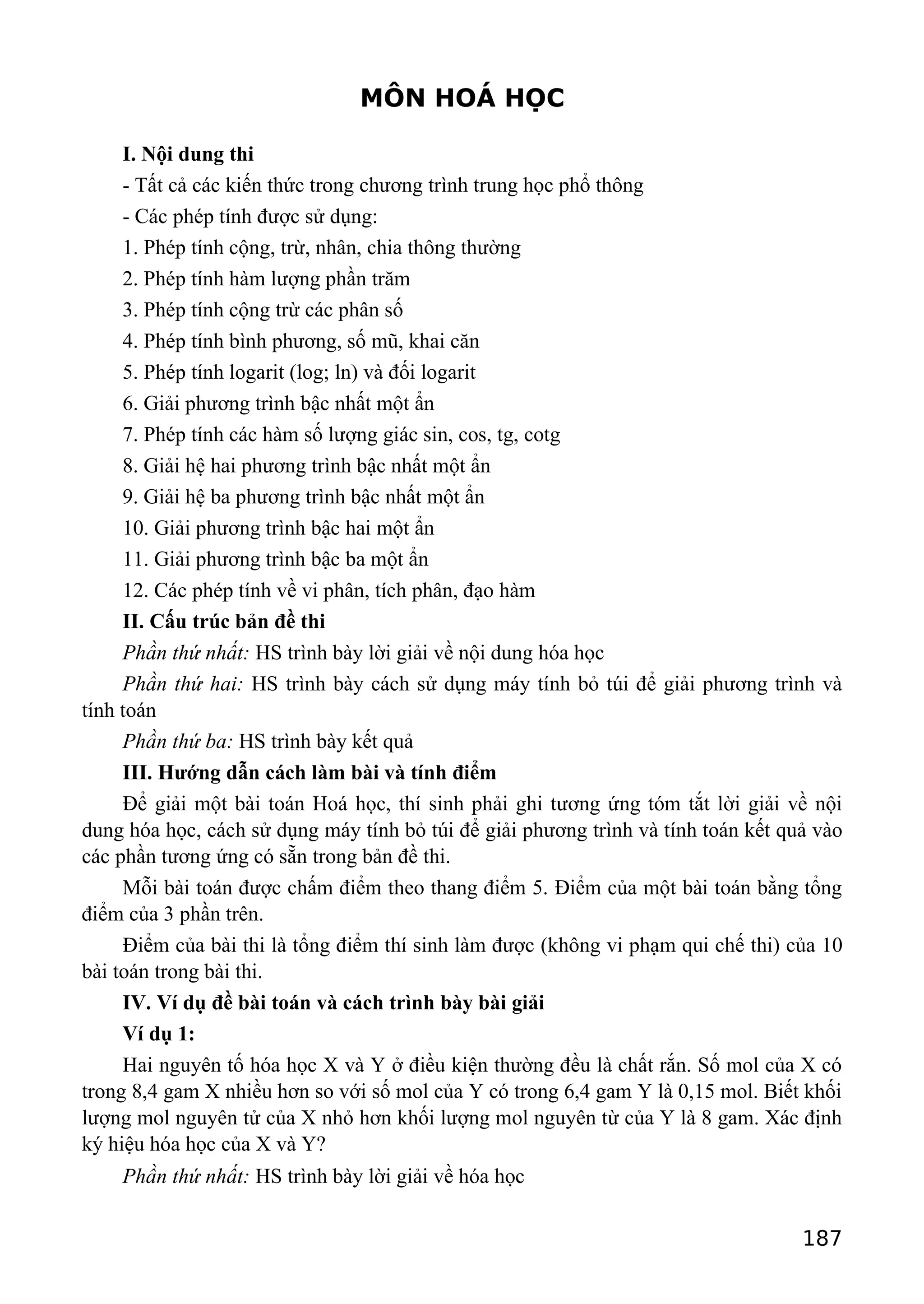 Tài liệu mô tả nội dung thi môn hóa học cho học sinh trung học phổ thông, bao gồm các phép tính hóa học và cấu trúc đề thi. Học sinh cần trình bày lời giải, cách sử dụng máy tính bỏ túi và kết quả cho từng bài toán. Tài liệu cũng cung cấp ví dụ chi tiết để minh họa cách làm bài và cách tính điểm.