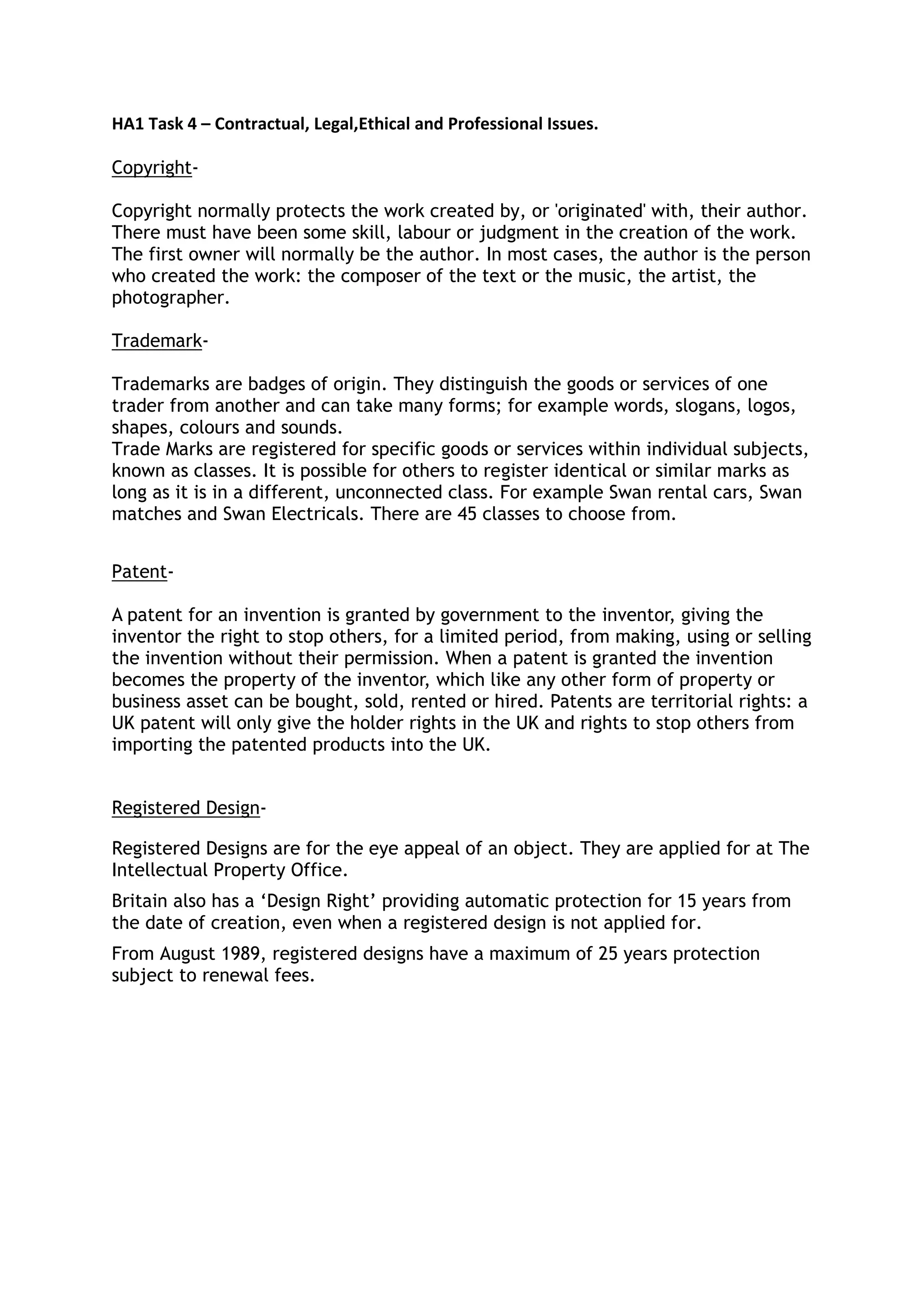 Copyright protects original works created through skill and labor, with the initial owner being the creator of the work such as an author, artist, or photographer. Trademarks distinguish the goods or services of businesses and can be registered for use in specific industries. Patents grant inventors a limited monopoly on their inventions, allowing them to prevent others from commercially exploiting the patented invention without permission. Registered designs protect the visual appearance or eye appeal of objects and can secure up to 25 years of protection if renewed periodically.