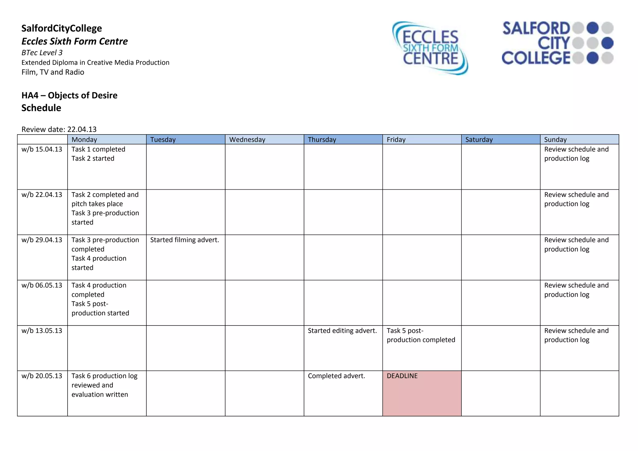 This document outlines the schedule for an extended diploma course in creative media production at Eccles Sixth Form Centre between April 15th and May 20th. It details the tasks to be completed each week, including pre-production, production and post-production work on an advertising project. Key deadlines include a pitch on April 22nd and the final deadline for submission on May 20th.