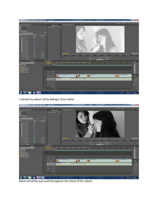 The advertisement fades in from white and uses black and white throughout, with dissolve transitions between the various long shots and close ups filmed from different angles. Various effects were added in Adobe Premier Pro and After Effects, including text at the end reading "Armani Code".