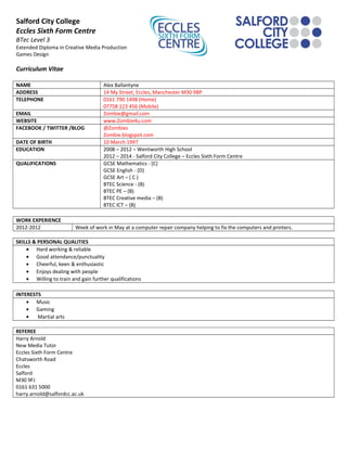 This curriculum vitae provides information about Alex Ballantyne, who is studying for a BTEC Level 3 Extended Diploma in Creative Media Production in Games Design at Salford City College Eccles Sixth Form Centre. Key details include Alex's contact information, date of birth, education history graduating from Wentworth High School in 2012 and currently studying at Salford City College, qualifications in subjects such as Maths, English, Art, Science, PE, and ICT. Work experience included a week helping with computer repairs in 2012. Personal qualities highlighted are being hard working, reliable, and having good attendance. Interests listed are music, gaming, and martial arts. The referee provided is Harry Arnold, the New Media T