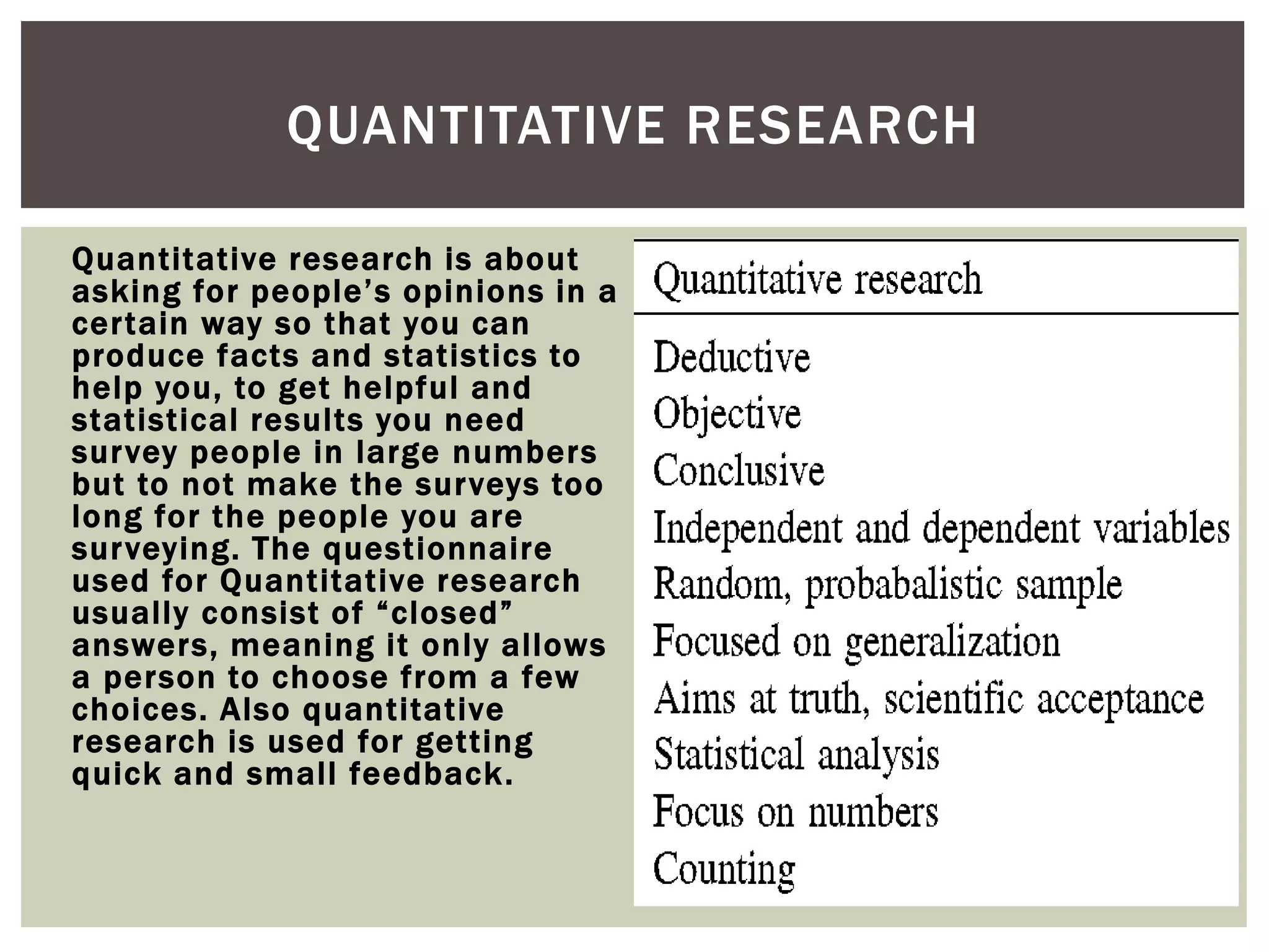 Quantitative research involves collecting large amounts of data through surveys with closed-ended questions to produce statistics about people's opinions. Qualitative research uses open-ended questions and collects detailed feedback through methods like interviews to understand people's behaviors and perspectives. Audience profiling determines the characteristics of a target audience beforehand so communicators can tailor their message effectively, such as getting feedback on a game through demos before completion.