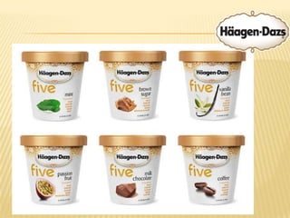 Haagen-Dazs is a premium ice cream brand established in 1961 in New York. It pioneered super-premium ice cream with unique flavors and high-quality ingredients. The brand has since expanded internationally and innovated new products like ice cream bars, frozen yogurt, and sorbet. Haagen-Dazs uses integrated marketing campaigns across various channels like print, television, outdoor, and online advertising to position itself as an indulgent luxury brand and drive brand awareness. It focuses on premium cafes and retail distribution while promoting new products through sampling events, social media contests, and cause marketing partnerships.