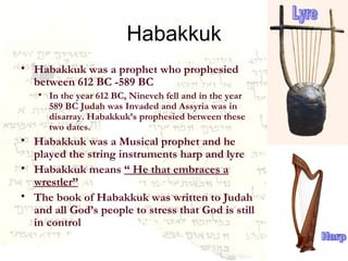 Habakkuk was a prophet who lived between 612 BC and 589 BC in Judah. The book of Habakkuk documents a conversation between the prophet and God, where Habakkuk questions God twice about the injustice and unrest in Judah. God answers both times, explaining that He will use the Babylonians to punish Judah for their sins, and instructing Habakkuk to have faith. The book transitions from Habakkuk's initial anxiety to hope in God through their dialogue and his final musical prayer of praise and trust in the third chapter.