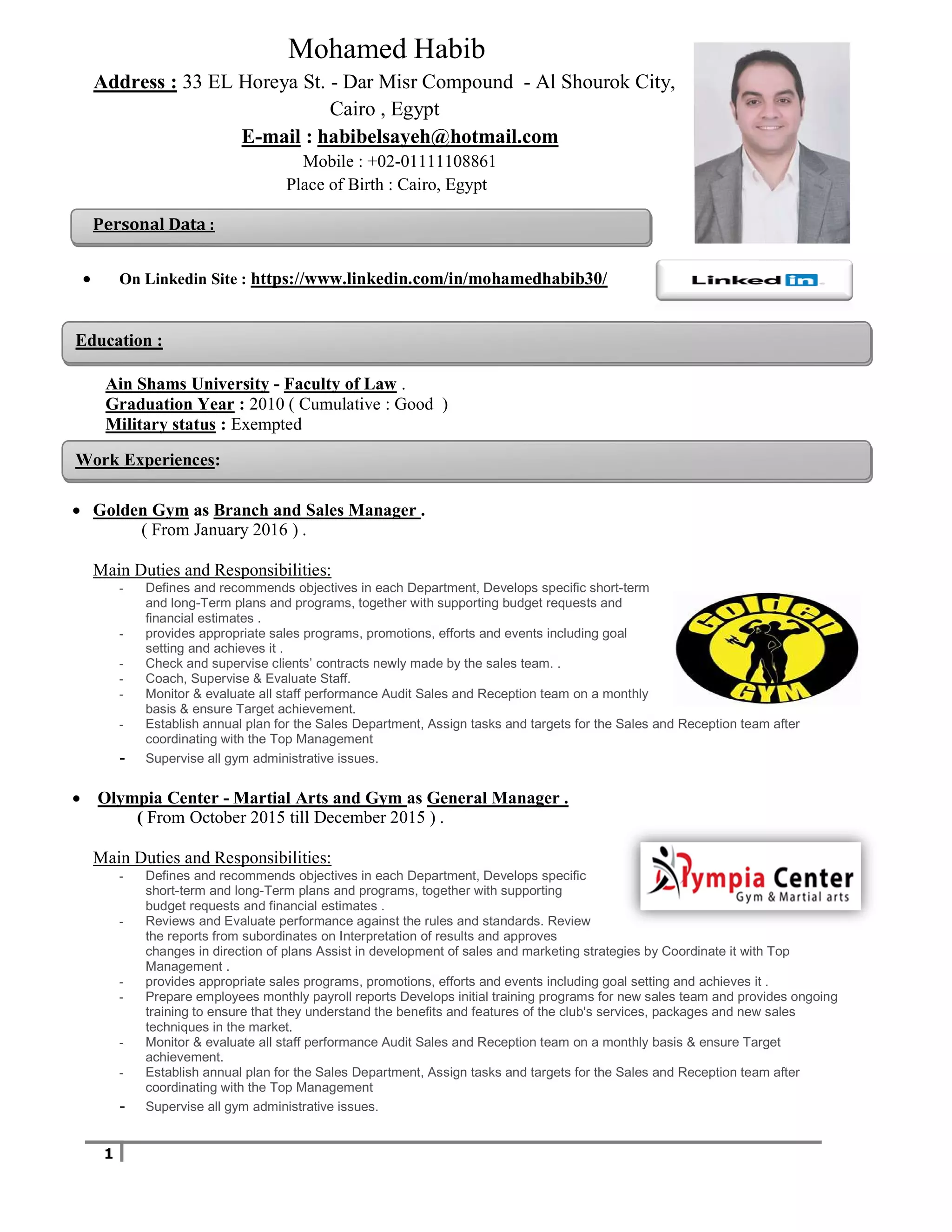 Mohamed Habib has over 10 years of experience in sales, management, and law. He held several management roles at gyms and telecommunications companies where he was responsible for sales, customer service, staff management, and ensuring sales targets were met. He has a law degree from Ain Shams University and additional business qualifications. Mohamed also had a successful career as a professional football player, winning championships and medals with several Egyptian clubs.