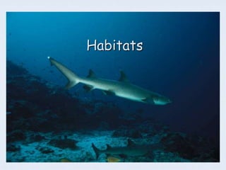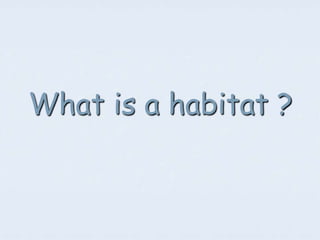A habitat provides living things with food, shelter, and everything they need to survive. It includes the whole surrounding area where an animal or plant lives. Many plants and animals are specially adapted to their particular habitat through features like camouflage, storage organs, insulation, or body shapes that suit the environment. Habitats meet an organism's needs and allow plants and animals to help each other through providing food, shelter, reproduction sites, and other functions.