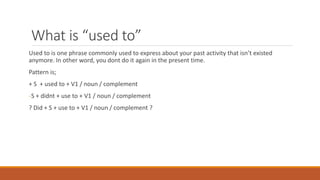 The document discusses the differences between "used to" and "be used to". Used to is used to talk about past habitual activities that are no longer happening, while be used to refers to past activities that are still ongoing in the present. It provides examples of sentence structures and sample sentences for both phrases, such as "She used to sleep late when she was young" and "She is used to study English for two hours". The document also lists common verbs that can be used with used to and be used to to talk about habitual past activities.