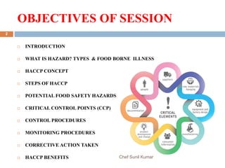 The document outlines the key concepts and steps of Hazard Analysis and Critical Control Points (HACCP), a systematic preventative approach to food safety. It discusses hazards like biological, chemical and physical contaminants that can cause foodborne illness. The 7 steps of HACCP are described, including identifying hazards and critical control points in food production processes. Monitoring procedures, corrective actions, and record keeping are important aspects of ensuring food safety through the HACCP system. The overall goal of HACCP is to anticipate and prevent risks of food contamination before they occur.