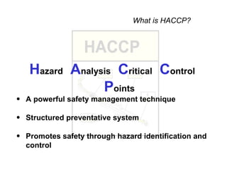 HACCP (Hazard Analysis and Critical Control Points) is a systematic preventative approach that identifies and controls hazards in the food production process. It involves assembling a team to analyze hazards, construct a flow diagram of the process, determine critical control points and critical limits. The goal is to implement control measures that eliminate or reduce significant hazards to protect consumer safety. Key aspects include hazard analysis, identifying critical control points, establishing monitoring and verification procedures, and maintaining documentation.