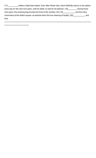 A boy named Ronnie gives an oral presentation about his grandfather's dog, Hachiko. Years ago, an Akita puppy was shipped from Japan to the United States but got lost at a train station. The puppy was found by a college professor named Parker Wilson. Though his wife did not want to keep the puppy, Parker bonded with it. The puppy's collar had a symbol meaning "good luck" in Japanese, so Parker named the dog Hachiko. Hachiko and Parker became very close, with Hachiko walking Parker to and from the train station every day. After Parker suddenly died of a heart attack at work, Hachiko continued faithfully returning to the train station every day