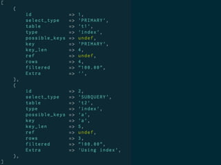 This document discusses MySQL Explain Parser, an open source Perl module that parses EXPLAIN query plans from MySQL. It provides an object-oriented interface for analyzing and working with the output from EXPLAIN queries, and includes examples of its use. The creator notes that support for multi-byte characters has been added and that a Go implementation is in progress.
