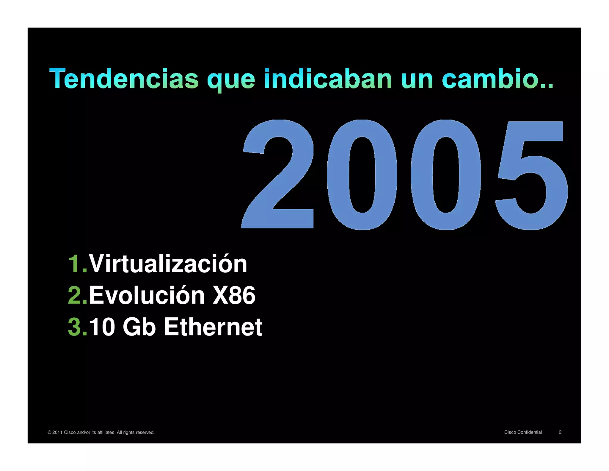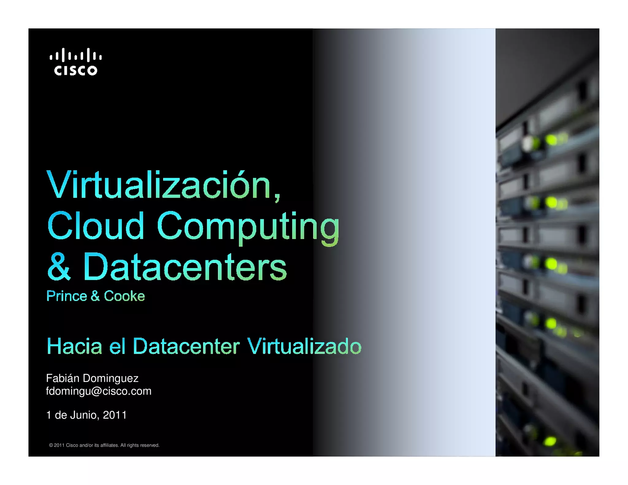 The document discusses the evolution of data centers towards virtualization and cloud computing. It highlights how technologies like the x86 platform and VMWare have enabled this change, and how networking, computing and storage systems need to evolve as well to support increased virtualization. This includes improvements in areas like virtual network integration, higher bandwidth connectivity, storage unification, faster provisioning times, and virtual desktop solutions. The network is positioned as the platform enabling these changes in virtualized data centers.