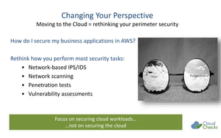 The document discusses strategies for securing cloud environments, particularly within AWS, emphasizing a shift from traditional perimeter security to managing cloud workloads. It highlights the importance of adapting security practices for ephemeral infrastructure, IAM access, and conducting continuous vulnerability assessments and patching. The document also introduces cloud management tools like CloudCheckr for monitoring security, availability, and cost in AWS deployments.
