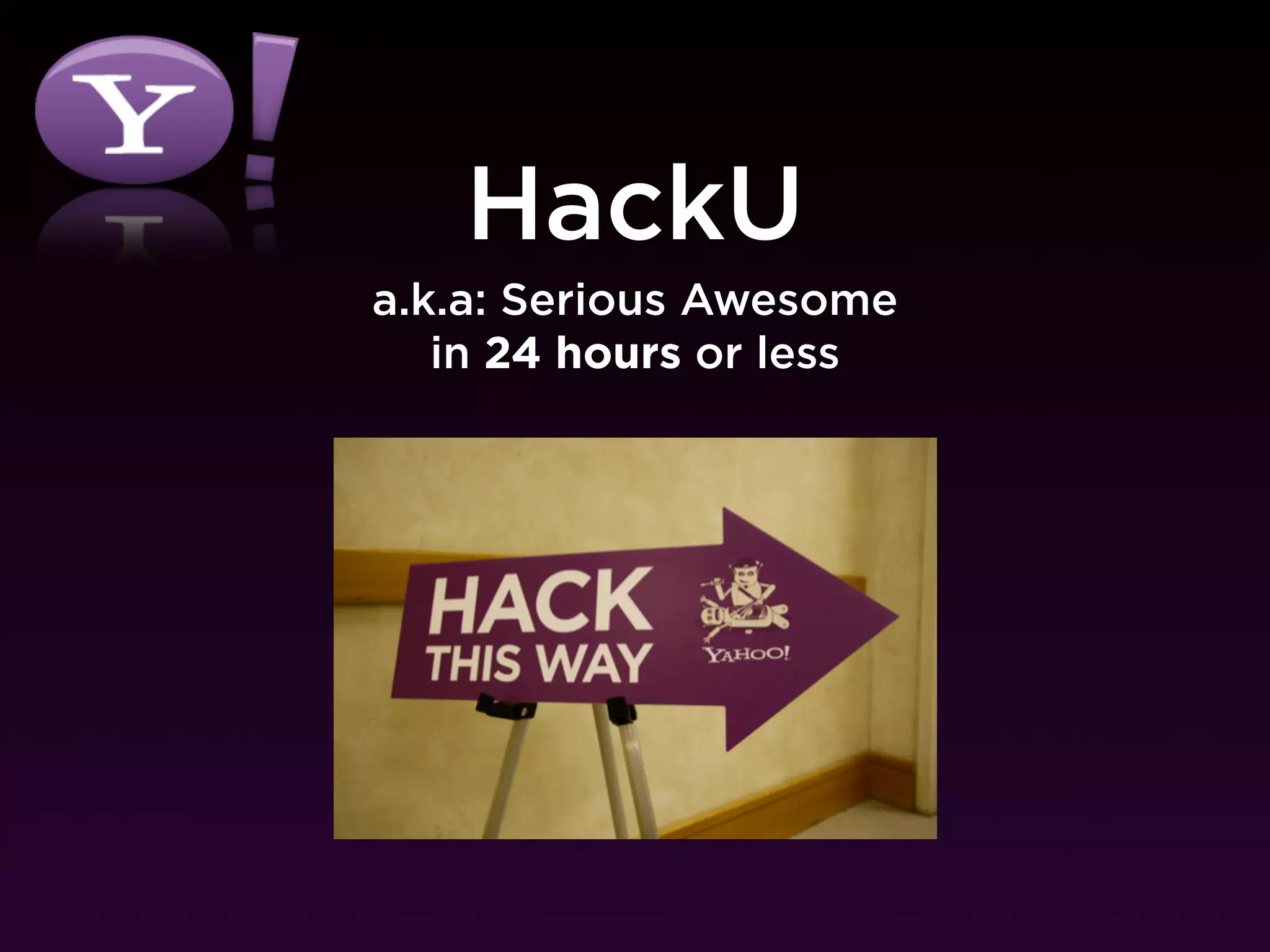 HackU is a 24-hour hackathon where participants have 24 hours to build a project in teams of up to 4 people. Participants will attend talks, have access to food/drinks, and support from other attendees. Projects can revolve around building, fixing, automating, or revolutionizing something. At the end, teams will have 90 seconds to demo their project and impress the judges. Yahoo and various websites provide resources and APIs to help participants build their projects. The hackathon kicks off with talks and then hacking begins the next day.