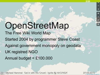 OpenStreetMap is a free and open source map of the world created by volunteers. It began in 2004 and now has over 1.3 million contributors who have mapped over 34.5 million km of roads and 91.7 million buildings globally. In Denmark, volunteers have mapped over 99.8% of roads and over 556,000 buildings. OpenStreetMap allows anyone to add and update map data to keep maps current and add important information not included by commercial maps. It also enables "counter-mapping" by communities to represent places not shown on traditional maps.