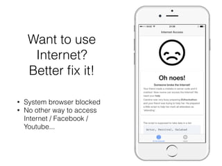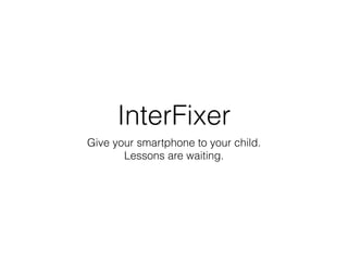 The document discusses 'interfixer', a platform designed to educate children by allowing them to unlock internet access on their smartphones through problem-solving tasks. It features a drag-and-drop editor for fixing bugs, a safe preselected list of websites, and incorporates gamification elements like a ranking system and achievements. Future plans include more challenging lessons and a progressive learning approach.