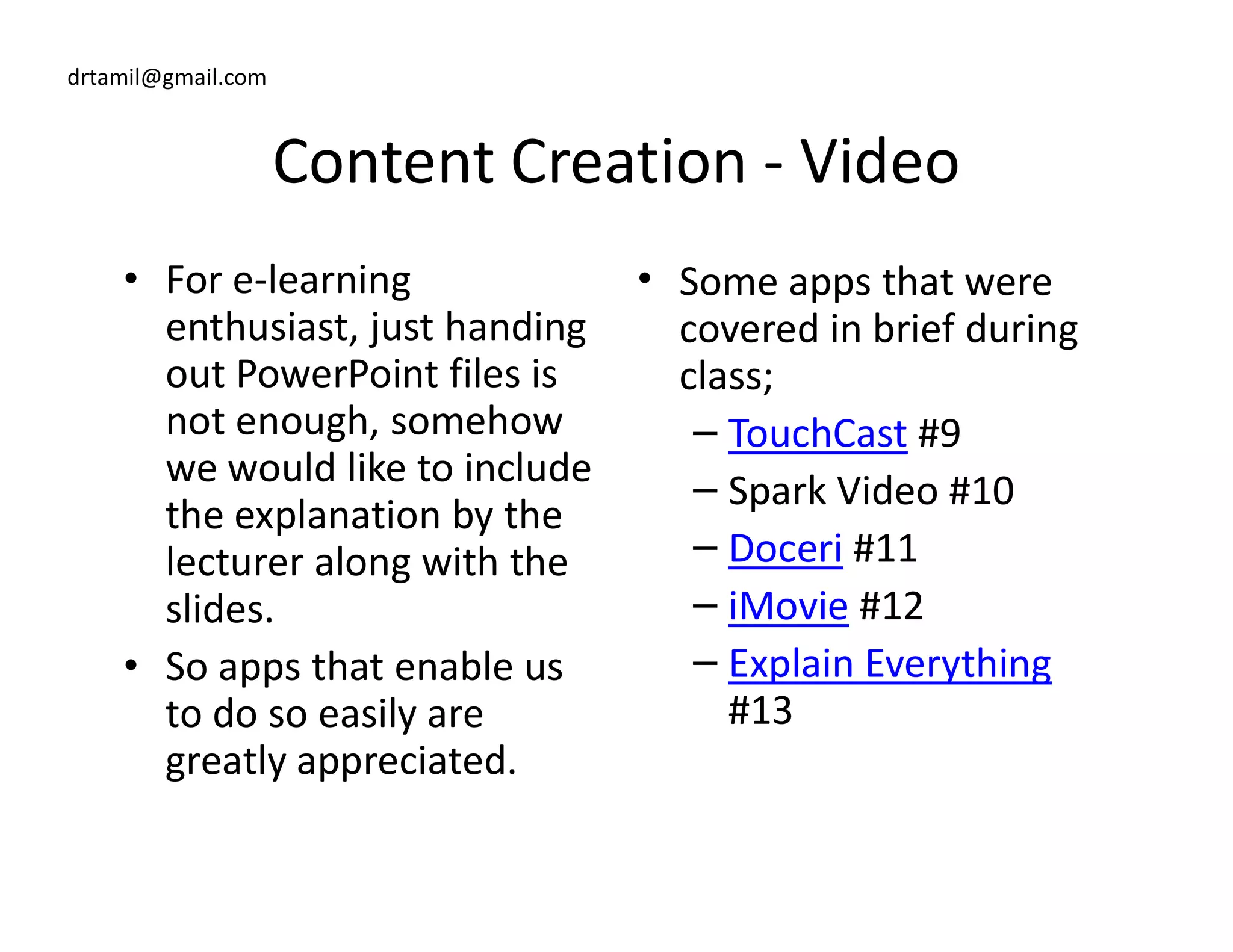 The document discusses several apps that can be used to create instructional videos including TouchCast, Spark Video, Doceri, iMovie, and Explain Everything. TouchCast allows users to create interactive videos by combining materials like presentations, PDFs, and websites and annotating them. Spark Video lets users create animated videos by adding slides, recording voiceovers, and adding graphics and music. Doceri is an interactive whiteboard that allows recording explanations while drawing on imported images. iMovie enables editing videos by adding clips, images, titles and text. Explain Everything is an annotation and screen casting app that allows importing and exporting content.