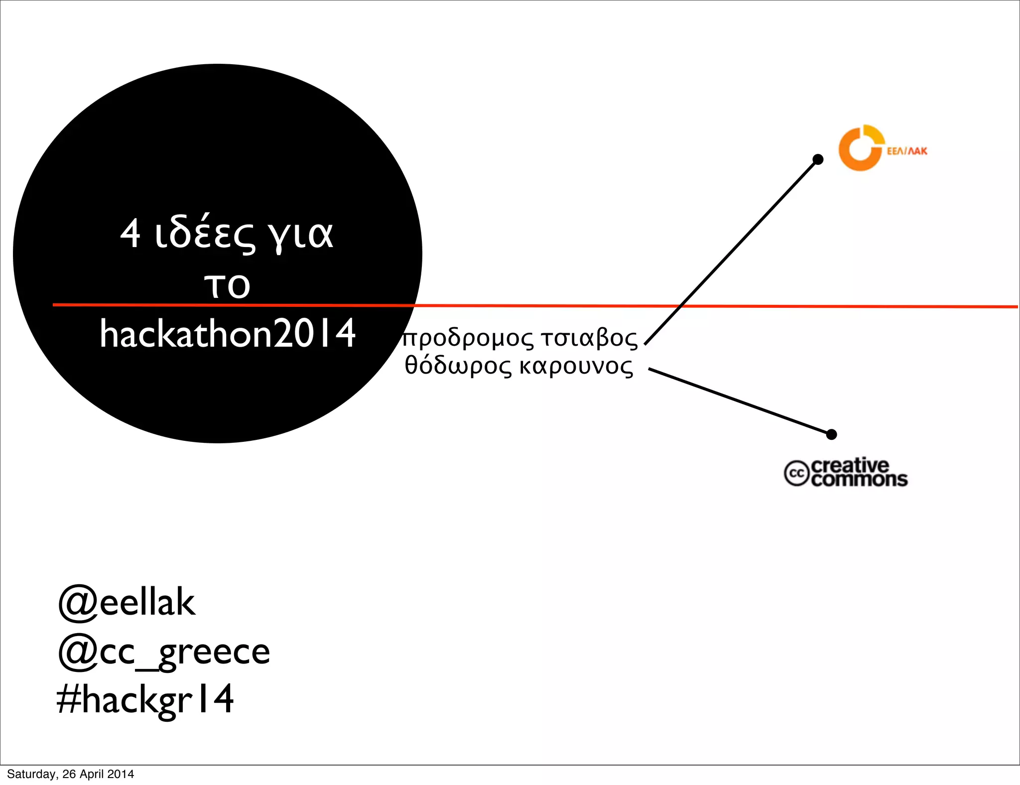 The document discusses ideas for hackathon2014. It mentions that EELL/LAC was founded in 2008 and now has 200 members and 8000 registered users. It also lists 4 ideas - who organizes hackathons, what can be created, and looking outside the box.