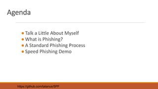 The document discusses phishing and describes a standard phishing process. It introduces the SpeedPhishing Framework (SPF), an automated tool that performs common phishing tasks like reconnaissance, setting up websites and sending emails, harvesting credentials, and creating a report. SPF aims to make phishing easier by handling repetitive tasks. The presentation demonstrates SPF and discusses features like collecting responses, pillaging accounts, and generating reports. Defense techniques are also briefly covered.