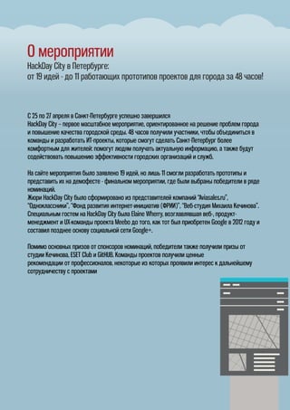 С 25 по 27 апреля в Санкт-Петербурге прошел hackday city, где участники разработали 11 прототипов из 19 предложенных идей за 48 часов. Мероприятие собралось, чтобы решить городские проблемы и улучшить качество городской среды, с участием жюри из представителей известных компаний. Победителями стали проекты в различных номинациях, среди которых приложения для поиска дешевых билетов, обмена вещами и информации о госструктурах.
