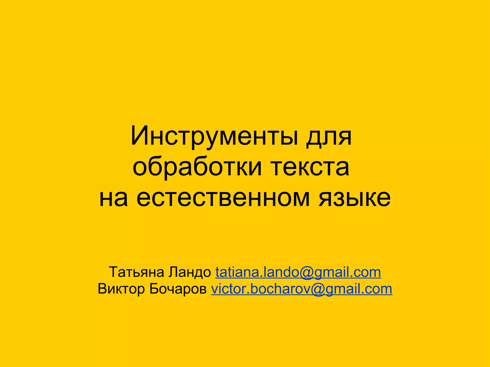 The document discusses various tools for natural language processing of Russian text, including Mystem, Snowball, Gate, AOT, and WordNet. Mystem and Snowball are open-source morphological analyzers. Gate is an open-source framework for natural language engineering that includes plugins for Mystem and Snowball. AOT is a commercial platform for Russian, English, and German that includes modules for grammar analysis, morphology, and interfaces for demonstrating module functionality.
