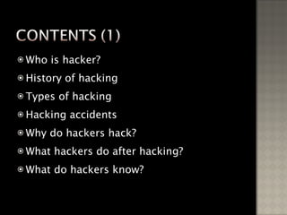 The document discusses the history and types of hacking, including famous hacking incidents. It provides information on how hackers operate after gaining access to systems, including installing backdoors and hiding their activities. The document also discusses how to protect against hackers by patching security holes, encrypting data, and monitoring networks with firewalls and intrusion detection systems.