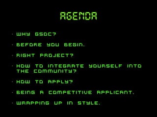 The document provides a comprehensive guide to participating in Google Summer of Code (GSoC), detailing the program's value, application timeline, project selection, and proposal writing. It emphasizes the importance of communication and etiquette within the open-source community, while offering tips on finding organizations, writing strong proposals, and making the most of the experience. Additionally, it highlights post-GSoC opportunities and stresses the significance of professionalism throughout the process.