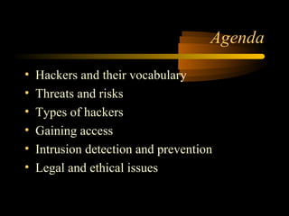 This document discusses hackers and network intruders. It defines key hacking terms and outlines the threats posed by different types of hackers. It also describes common methods used by hackers to gain unauthorized access, such as exploiting software vulnerabilities, password guessing, and using backdoors or trojan horses. The document discusses intrusion detection and prevention techniques and some legal and ethical issues surrounding hacking.