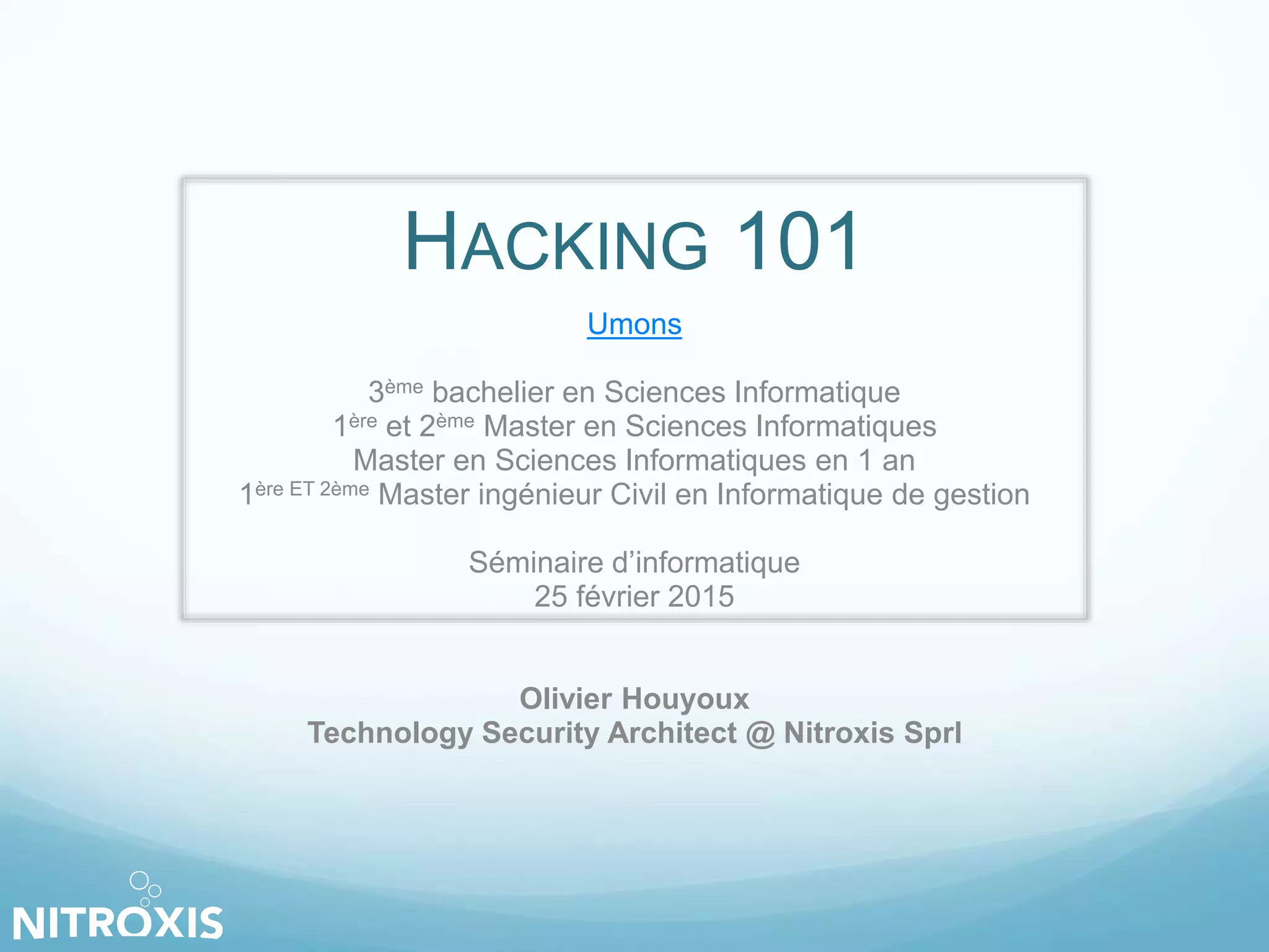 The document outlines a seminar on web application security, addressed by Olivier Houyoux from Nitroxis, emphasizing the importance of securing web applications against vulnerabilities. It covers the OWASP Top 10 security flaws, including injection, broken authentication, and cross-site scripting, along with real-life examples and mitigation strategies. The seminar aims to enhance awareness and provide resources for improving security in web applications.