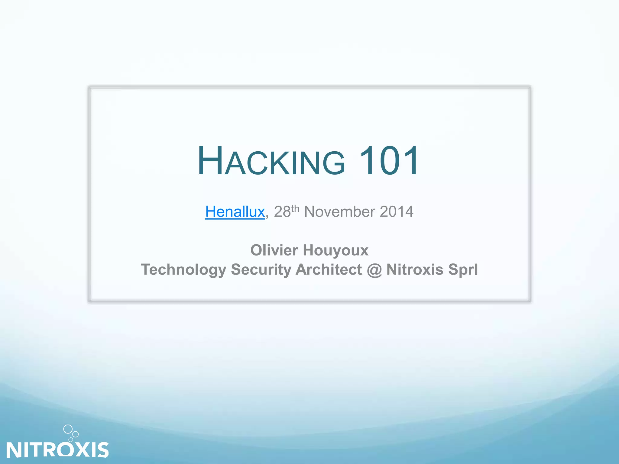The document covers web application security, presenting a schedule that includes the importance of web application security, real-life hacking examples, and the OWASP Top 10 vulnerabilities from 2013. It details various security flaws like injection attacks, broken authentication, and cross-site scripting, providing examples and best practices for addressing these issues, along with tools and resources for education. The presentation emphasizes the need for a layered defense strategy in protecting sensitive data and applications.