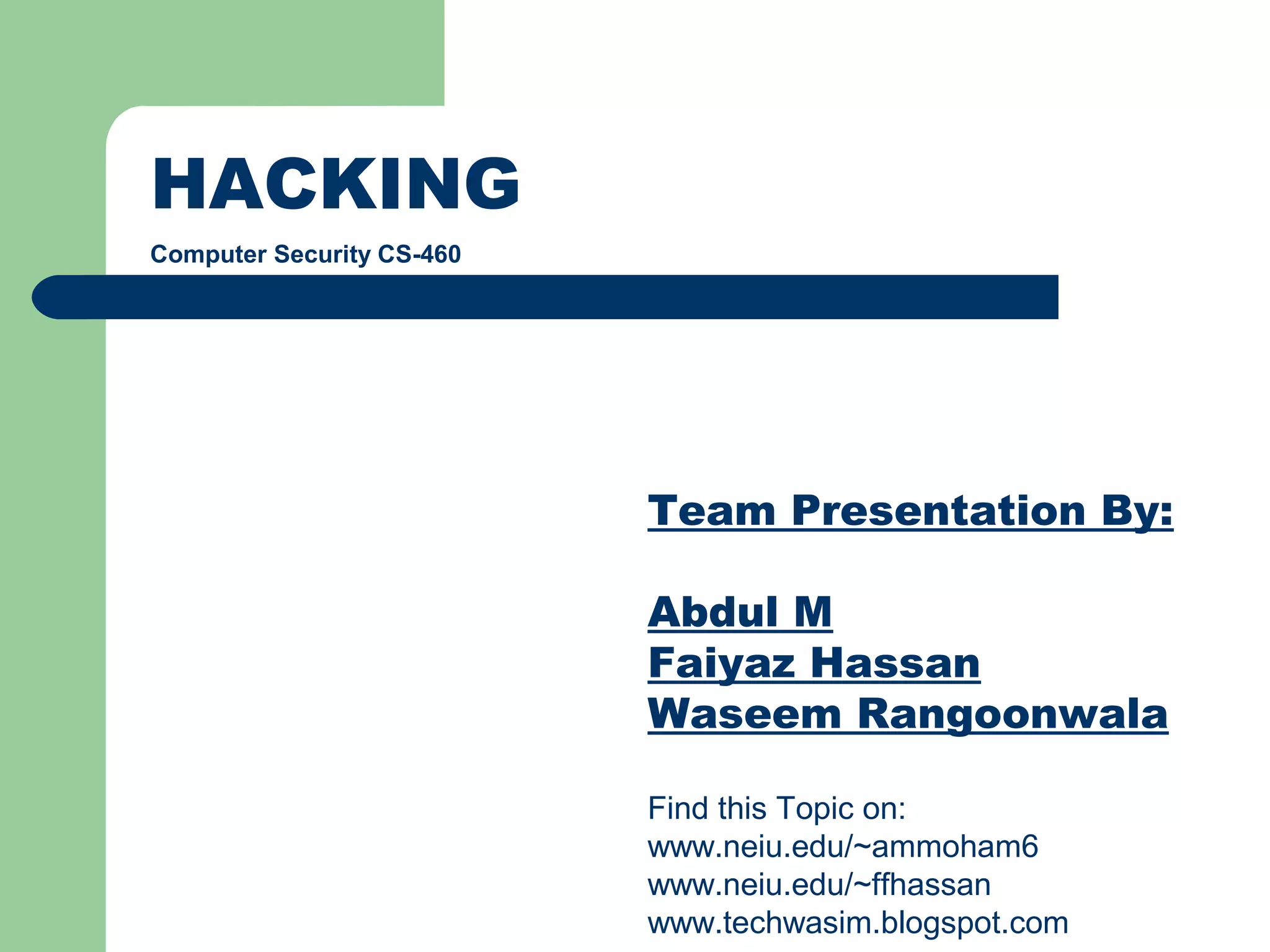 This document provides an overview of hacking and computer security. It defines hacking as intruding on someone else's information space for malicious purposes. It then discusses the brief history of hacking from the 1980s to present day. Next, it profiles some famous hackers throughout history and outlines the typical hacker attitude. The document concludes by describing basic hacking skills, the process of hacking, and common hacking tools and techniques such as port scanning and denial of service attacks.