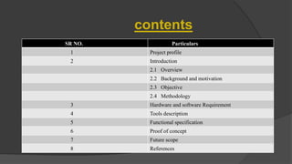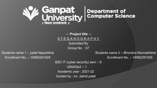 Steganography is the practice of hiding secret information within ordinary files like images, videos, and audio. The document discusses various steganography tools that can be used to hide text, images, audio, and video files within carrier files. It provides examples of using tools like Stegsnow and StegHide to hide messages in images and text files. The document also gives a live demo of hiding an audio file within a text file to showcase steganography techniques. The goal of the project is to reliably transfer secret messages while hiding their presence from third parties.