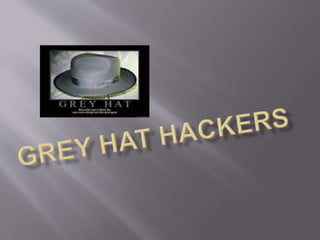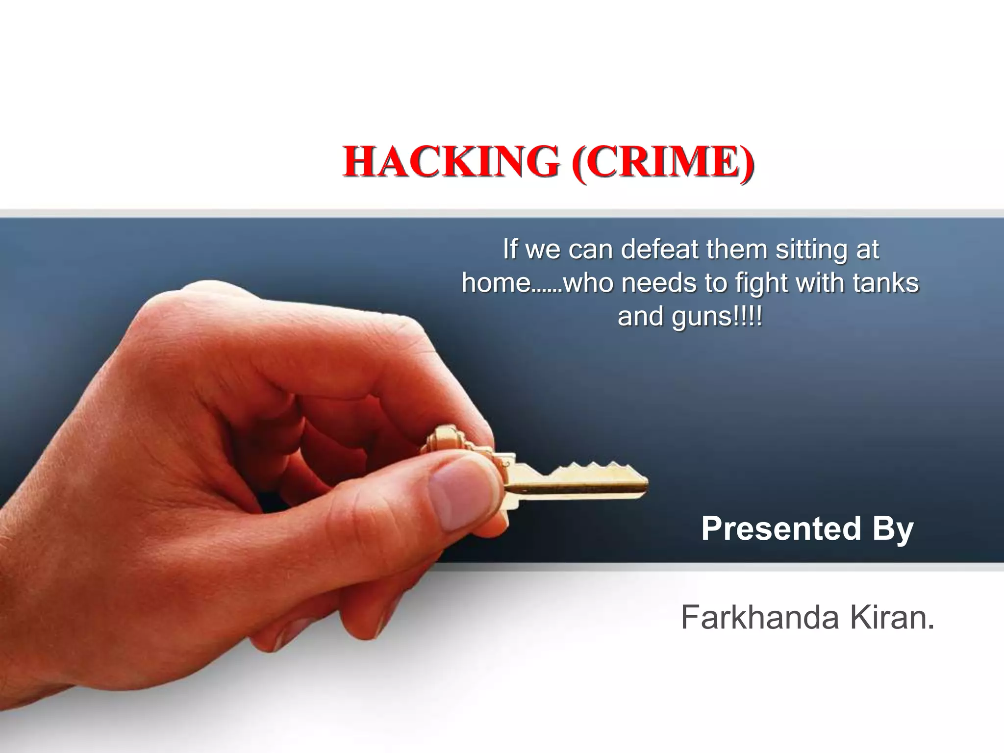 This document discusses hacking (cybercrime) and defines it as illegally accessing computer systems or networks without authorization. It outlines the history of hacking from the early positive use of the term to refer to clever programming to the modern negative connotation involving illegal activity. It describes different types of hackers (black hat, white hat, grey hat) and types of cybercrimes like hacking, denial of service attacks, and software piracy. Laws around catching and punishing hackers are also summarized.
