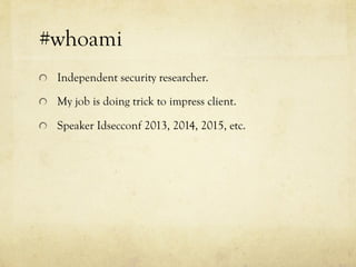 The document discusses hacking a BLE smartwatch. It begins with an introduction of the speaker as an independent security researcher. It then covers relevant research on authenticating Mi Band 2 and reverse engineering BLE from Android apps. The rest of the document discusses the speaker's process of discovering the authentication procedure of a smartwatch by using tools like GATTACKER, Android hcidump, and FRIDA to actively sniff the communication and map out the characteristic UUIDs and handles. It concludes with a proof-of-concept script to demonstrate altering the authentication by adjusting a recent proof-of-concept from another researcher.