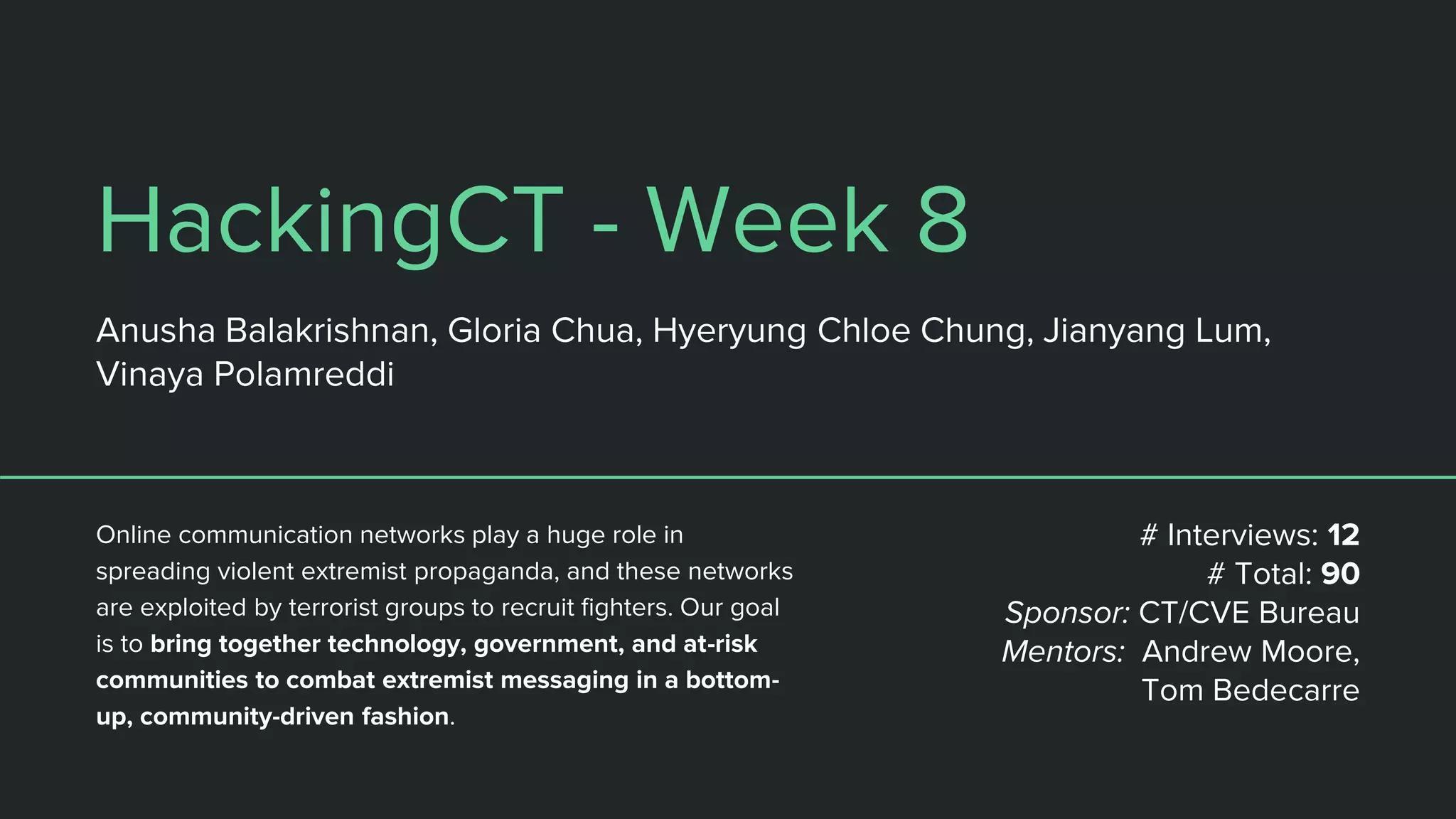 The document summarizes the work of HackingCT - Week 8. It discusses using technology, government, and at-risk communities to combat extremist messaging in a bottom-up manner. It details 12 interviews conducted so far with 90 total. The goal is to bring credible former extremists and family/friends of radicalized individuals together to provide help and information to those at risk of radicalization through an anonymous textline. The proposed MVP and mission model canvas are described.