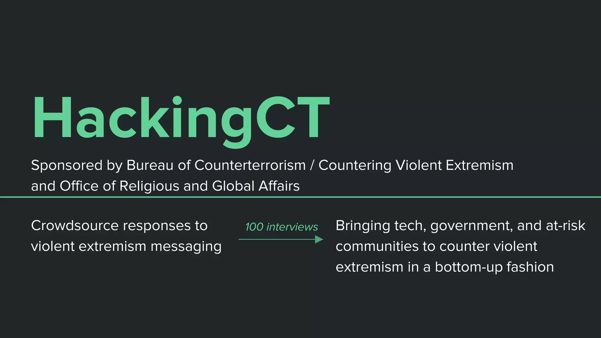 The document outlines the efforts of HackingCT to counter violent extremism (CVE) through community engagement, interviews, and collaboration with various organizations. Key initiatives include building a support textline for individuals and families, promoting scalable local messaging, and leveraging technology for outreach. The focus is on personalized prevention strategies and developing effective interventions to deter individuals from extremist groups.