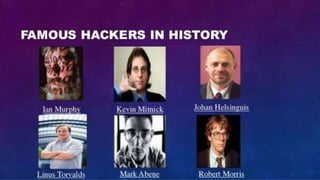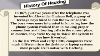 The document outlines a seminar on hacking, including its definition, history, types, techniques, and security measures. It explains the different motivations behind hacking, such as fun or malicious intent, and provides guidance on what to do after being hacked and how to secure data. Additionally, it highlights both the advantages and disadvantages of hacking practices.
