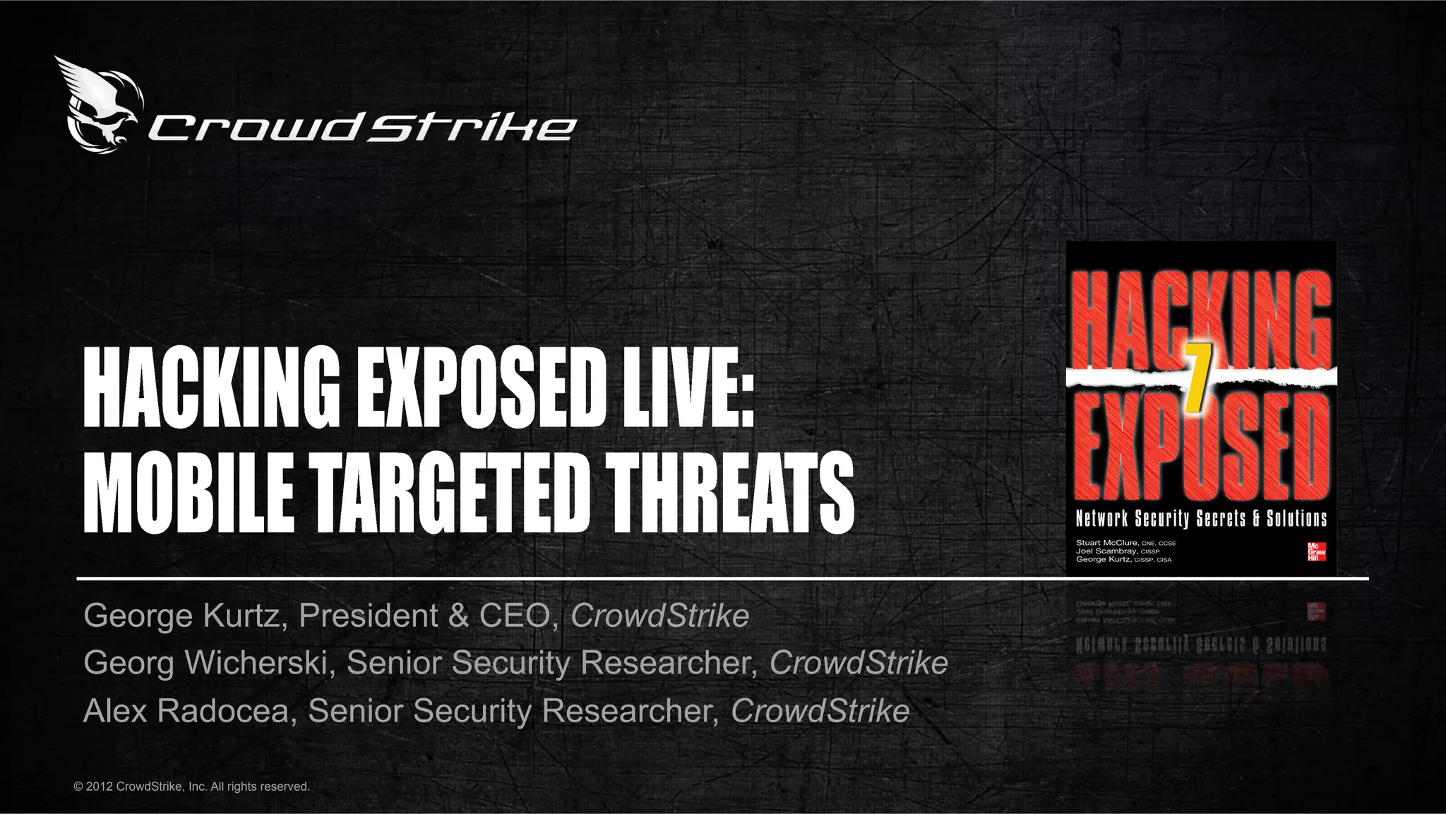 The document introduces CrowdStrike speakers George Kurtz, Georg Wicherski, and Alex Radocea. It then discusses the evolution of threats from commercial remote access tools (RATs) to targeted RATs and advanced threats. Examples of commercial RATs like FlexiSPY and targeted RATs like LuckyCat are analyzed. The feasibility of developing exploits and native Android RATs is also explored.