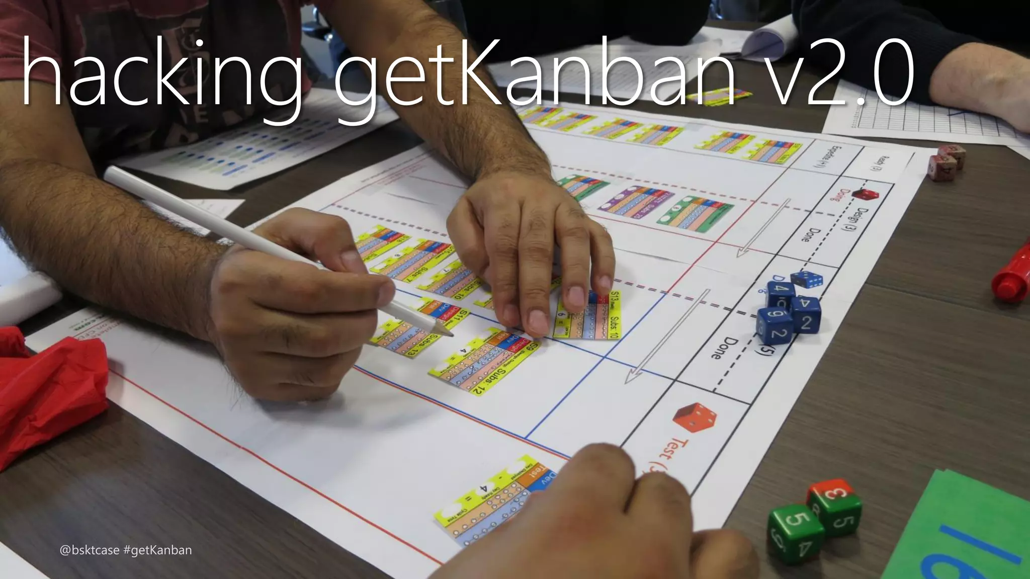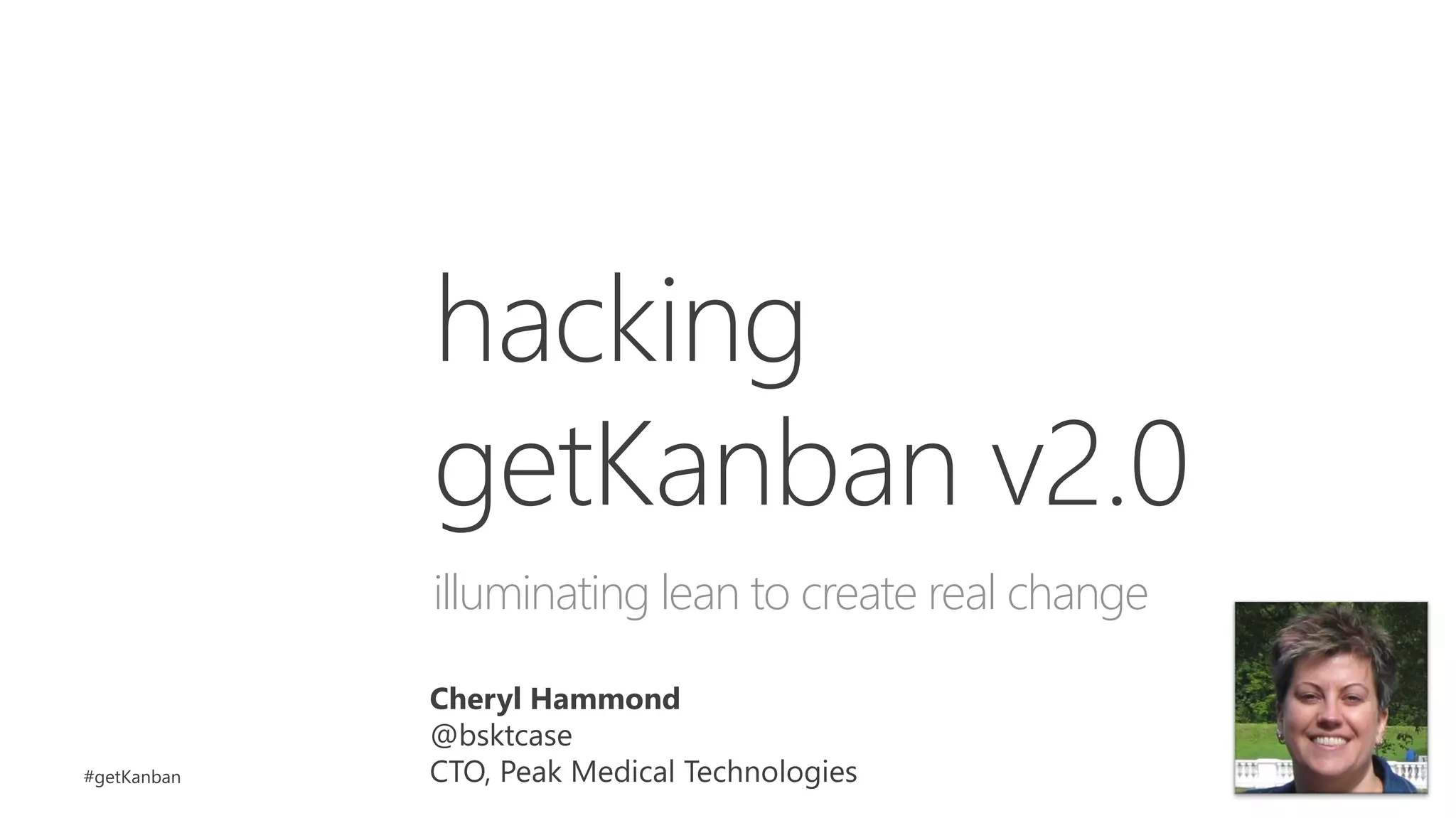 The document discusses the 'GetKanban v2.0' event led by Cheryl Hammond, emphasizing the application of lean principles to foster real change in software development. It outlines the agenda, includes interactive elements like case studies, and encourages participants to engage, provide feedback, and experiment with the game. Key concepts such as resource allocation, backlog management, and cycle time are also highlighted to aid participants in practical learning.