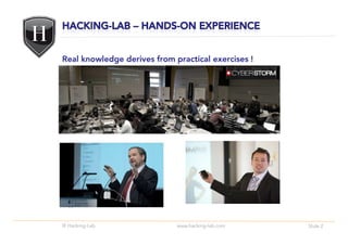 The document describes a hacking day event hosted by Digicomp on June 14, 2012. It promotes Hacking-Lab, an online platform for security training and challenges. The platform offers various security topics to learn, a point-based system to track skills, and certifications. It is aimed at helping individuals and organizations improve their cybersecurity skills. The document provides information on upcoming hacking challenges and qualifications in Austria during 2012 and invites people to register on the Hacking-Lab website.