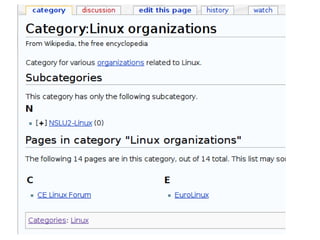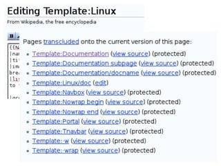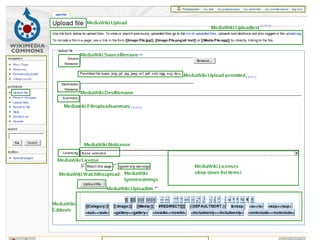 The document provides detailed information about MediaWiki, an open-source wiki engine software designed for Wikimedia projects like Wikipedia. It covers the structure, customization options, templates, and bots within MediaWiki, as well as the MediaWiki API for interacting with various functionalities. Additionally, it discusses user rights, namespace management, and community resources for further support.