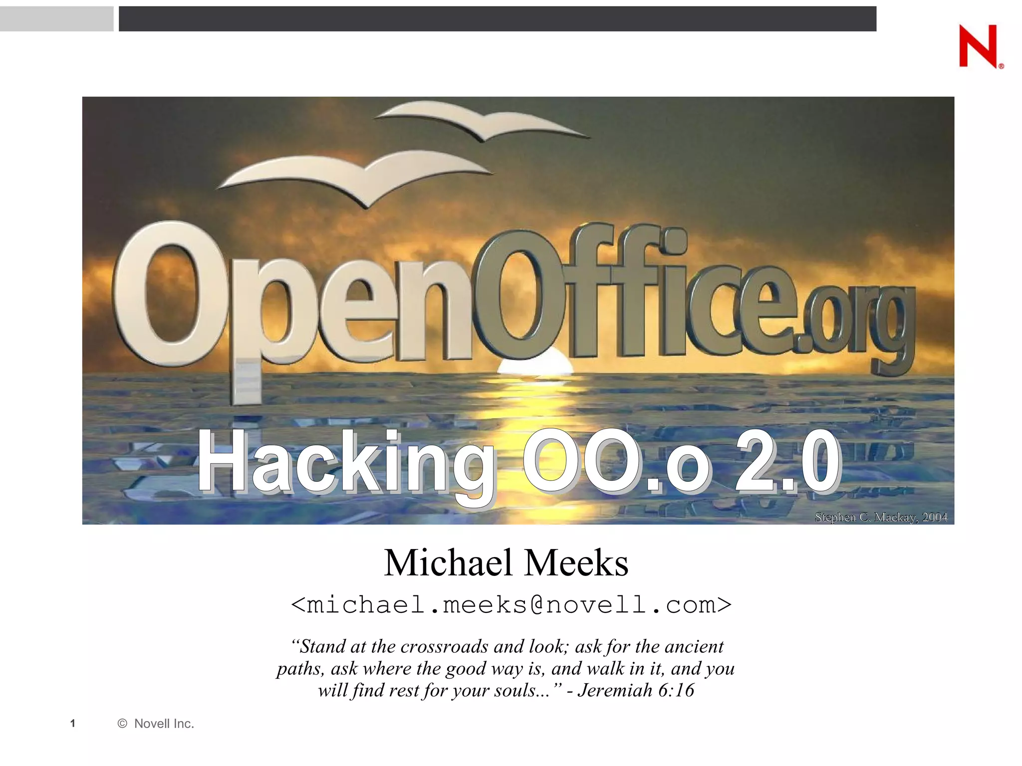 The document provides an overview of OpenOffice.org (OO.o), highlighting its key features and advantages over other office suites. It discusses OO.o's development community and process, and previews some new features in OO.o 2.0 like improved ergonomics, performance enhancements, and expanded file format support. The document encourages participation in the OO.o project through tasks on their wiki and signing the JCA agreement.