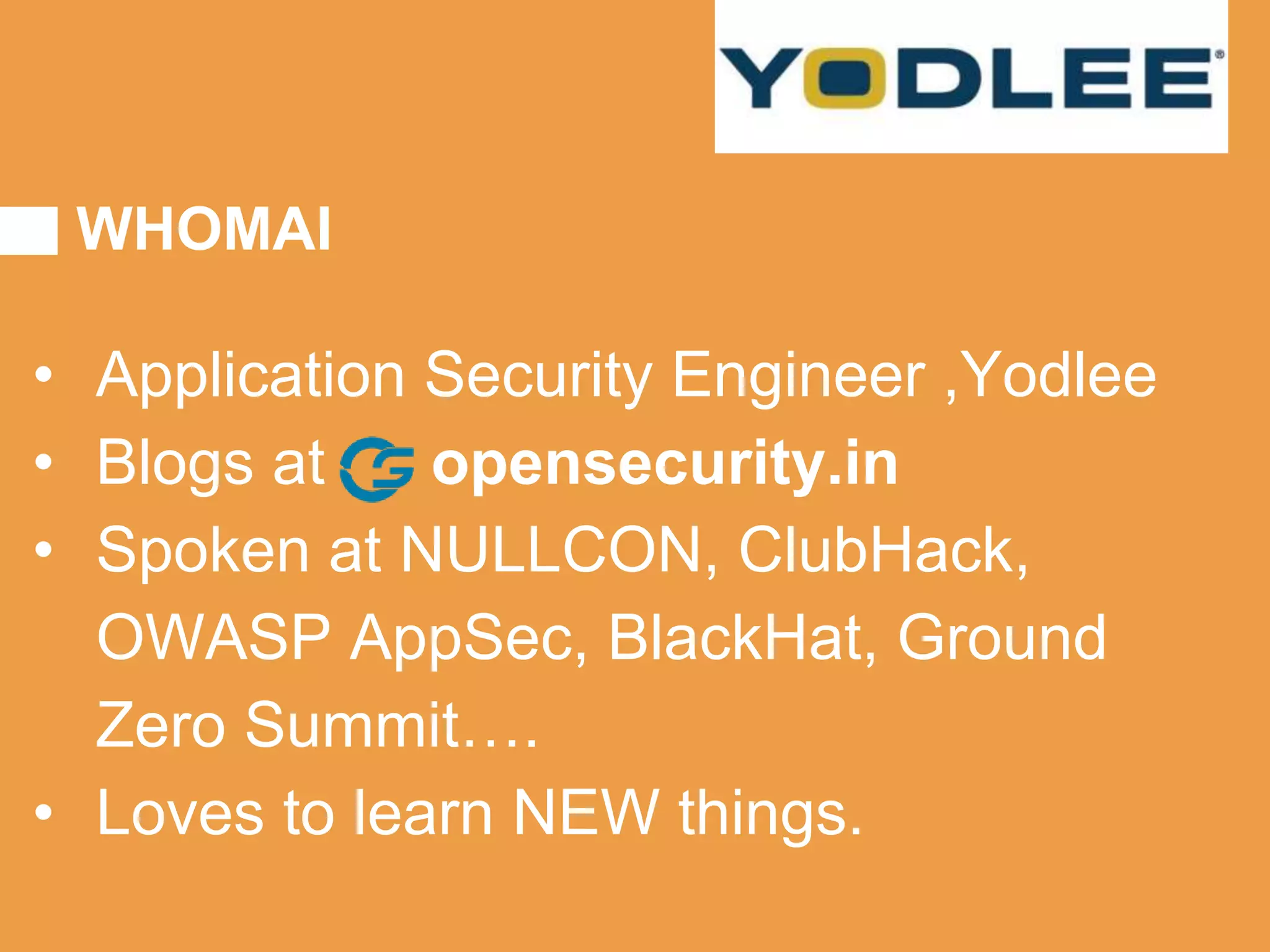 Tizen is an open source operating system that can run on various devices including smart TVs and IoT devices. It uses a security model that isolates applications using SMACK mandatory access control and enforces content security policies for web applications. The presentation discusses hacking techniques tested against Tizen like exploiting shellshock vulnerabilities, bypassing address space layout randomization protections, and circumventing content security policies. It also provides an overview of methodologies for analyzing Tizen application security like static analysis of manifest and configuration files, decompiling native applications, and network analysis using a proxy. Overall the presentation evaluates the security of Tizen and highlights some implementation issues found.