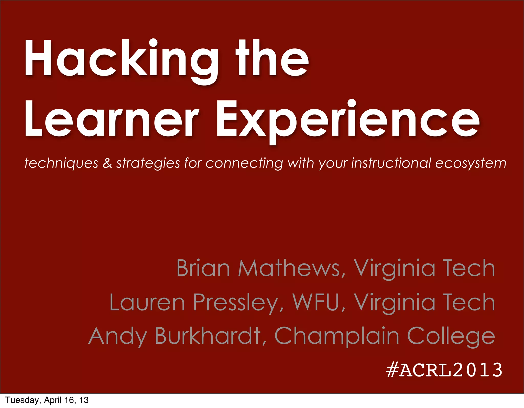 The document summarizes key points from a conference presentation about hacking the learner experience. It discusses how the term "hacker" has unfair negative connotations but really means testing boundaries. It also shares quotes from Mark Zuckerberg and Larry Page about using technology to improve lives. Various learner taxonomies are presented, including Bloom's and Perry's, as well as Kolb's experiential learning model. Strategies are suggested for engaging different learner types.