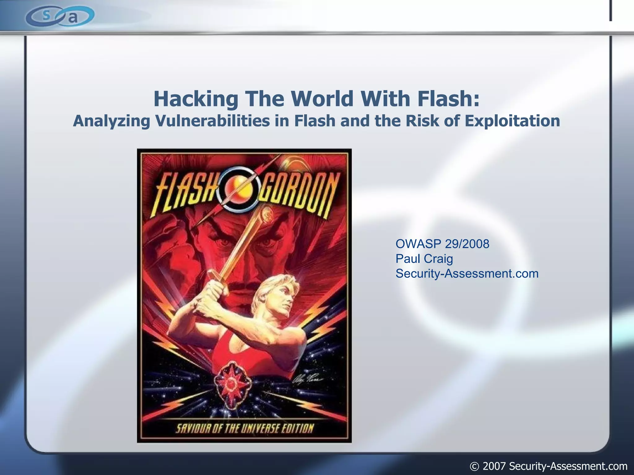 The document discusses vulnerabilities in Adobe Flash and the risk of exploitation. It provides a history of Flash exploits from 2001-2008, noting common bugs like file format validation issues and input validation errors. It analyzes trends in Flash security advisories, finding that almost half of vulnerabilities allow remote code execution. The document warns that a Flash virus or worm is inevitable given the widespread use of Flash and continued emergence of vulnerabilities.