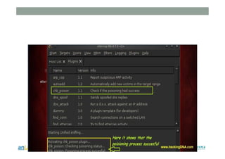 This document provides instructions for performing various tasks in Backtrack 5 such as gathering information from websites and domains, network scanning, packet sniffing, and man-in-the-middle attacks. It begins with safety cautions and instructions for configuring network settings in Backtrack. It then explains how to use tools like apt-get, HTTrack, Whois, Zenmap, Wireshark, and Ettercap to collect information and conduct attacks. The document emphasizes the educational purpose of these techniques and cautions the reader not to use them for harmful purposes.