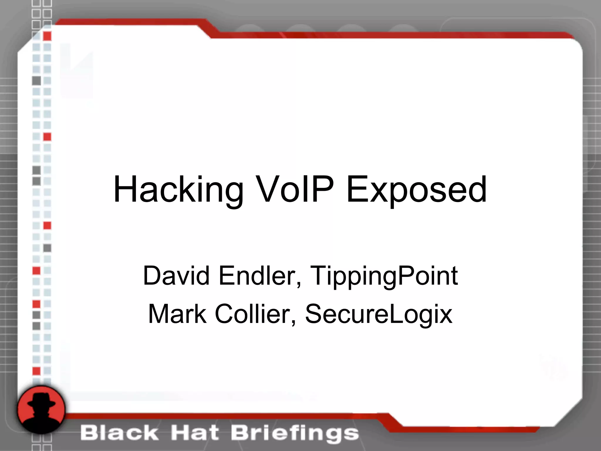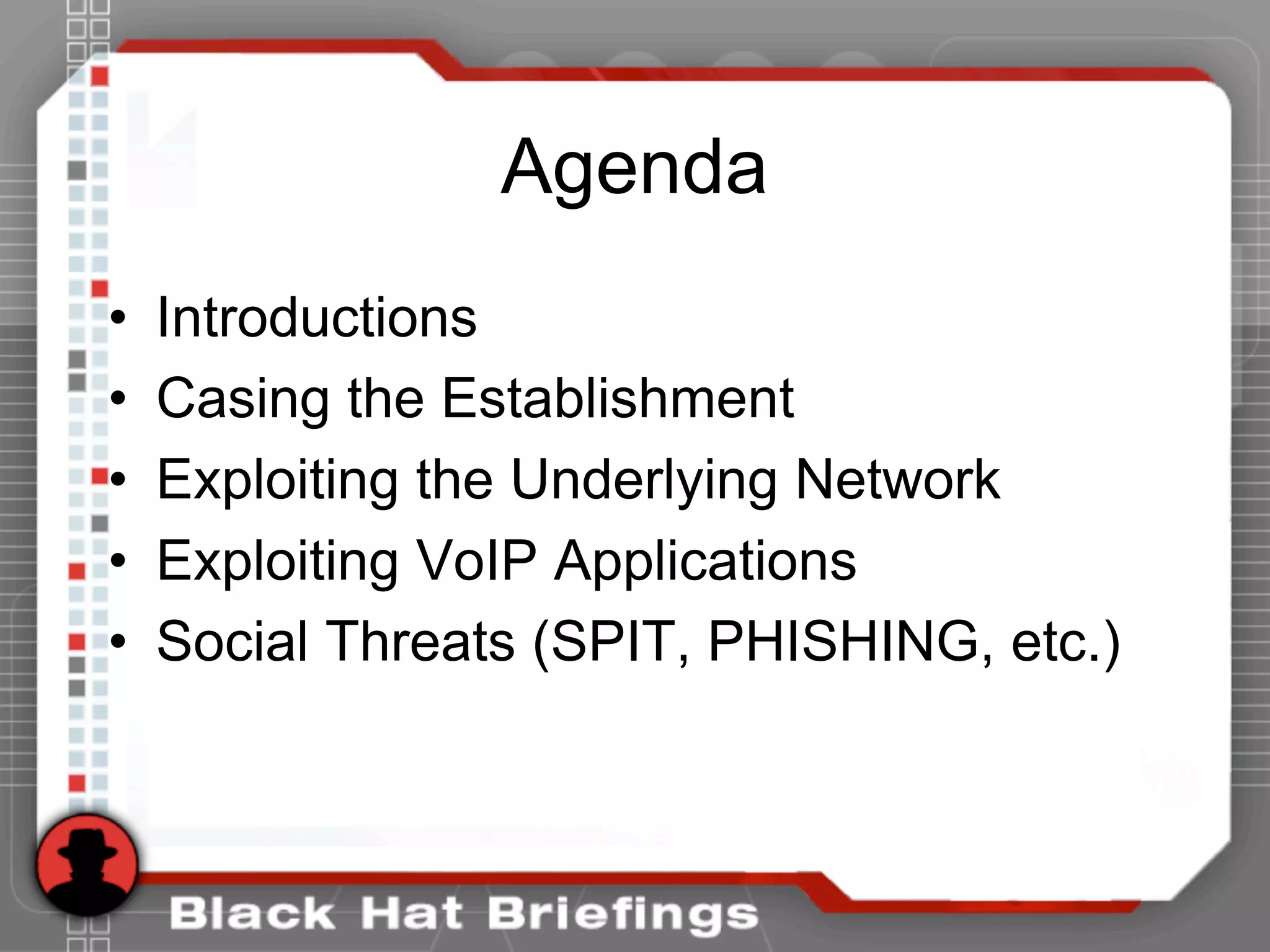 This document summarizes a presentation on hacking VoIP systems. It begins with introductions of the presenters and an overview of VoIP security risks. The agenda is then outlined, covering footprinting, scanning, and enumerating VoIP systems to obtain information. Techniques for exploiting the underlying network through man-in-the-middle attacks and eavesdropping are discussed. Finally, exploiting VoIP applications through fuzzing, denial of service, and signaling manipulation will be covered.